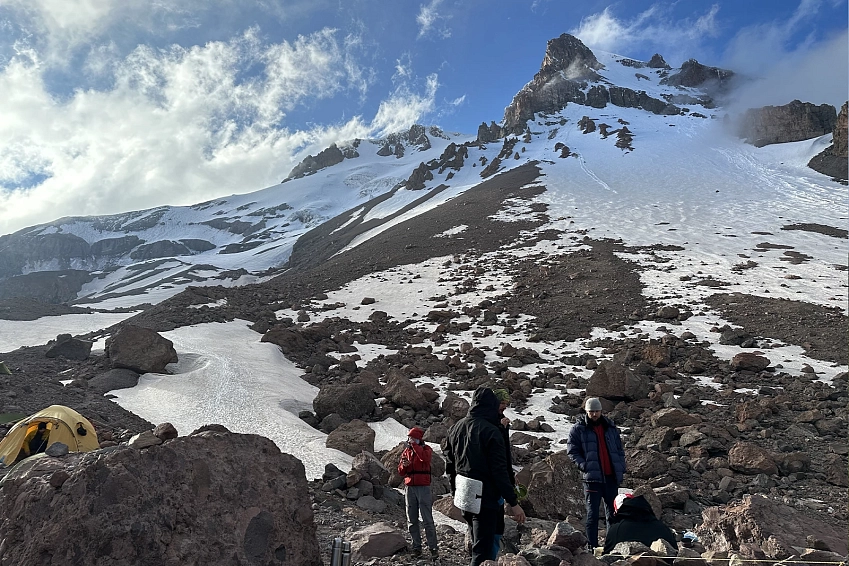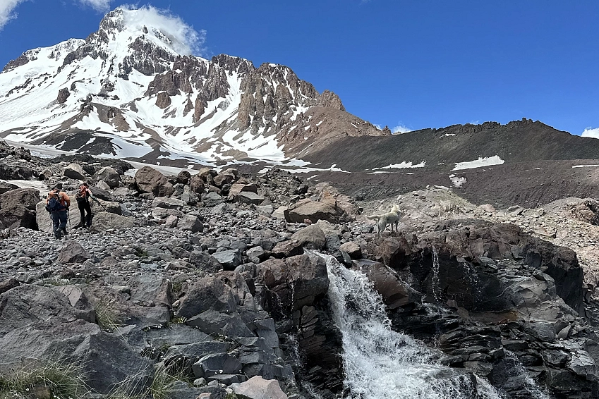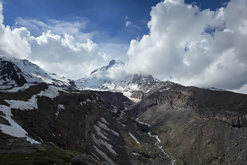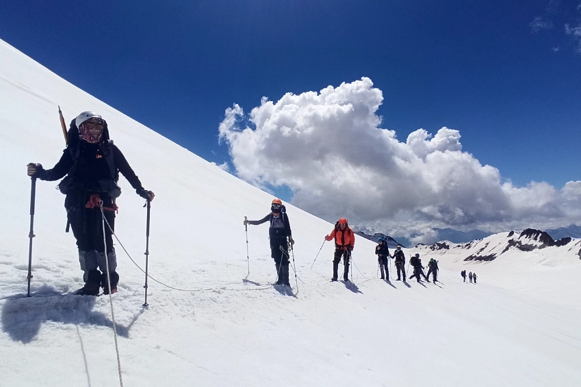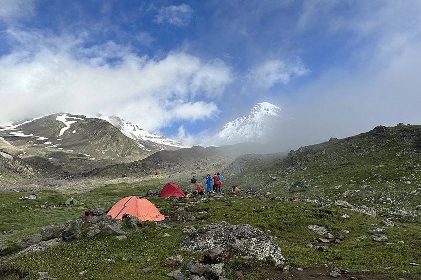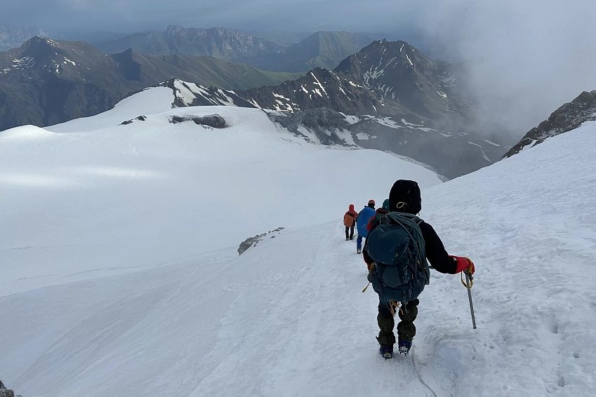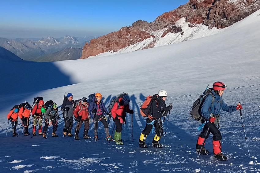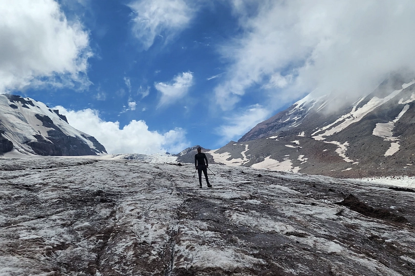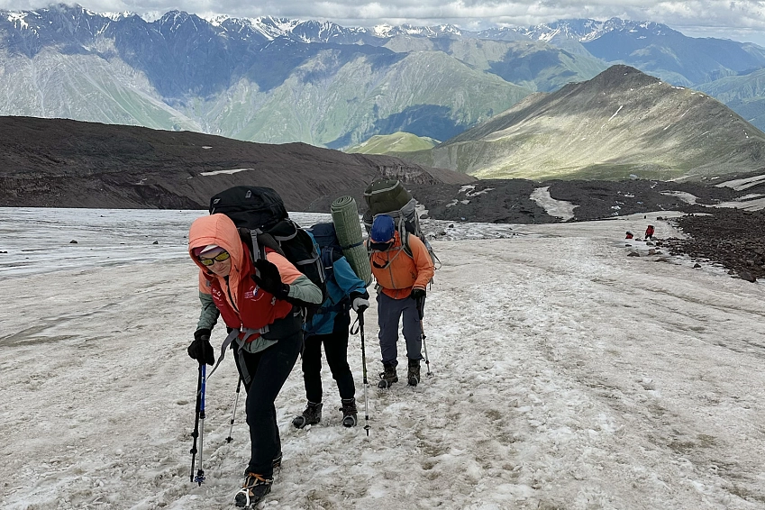 适应性训练。我们将攀登至海拔4400米的奥茨韦里冰川,沿途穿越石地和冰川,避开多处裂缝。在这里,您永远不会感受到安静,卡兹别克山的陡峭岩壁上不时有落石,轰鸣声在整个峡谷中回荡。我们将进行登山技能的实操训练:冰爪行走技术、使用冰镐在雪坡上自我止滑的技术,以及沿绳索扶手移动的技巧。上行约5小时,下行约2小时。