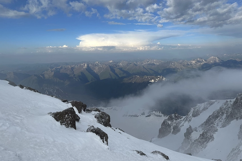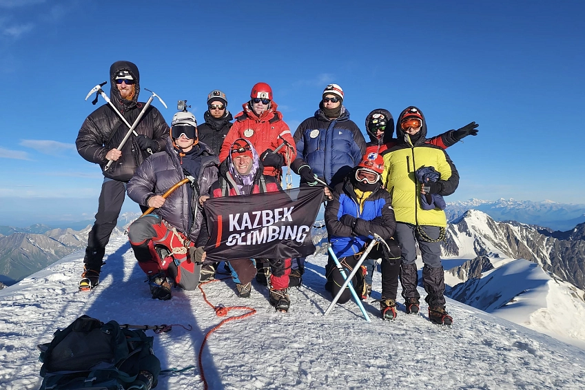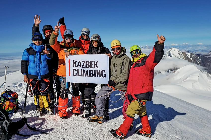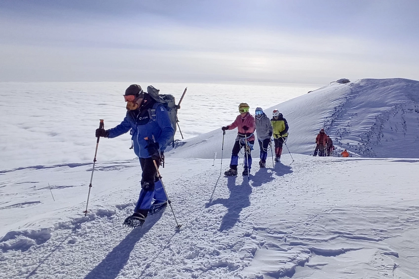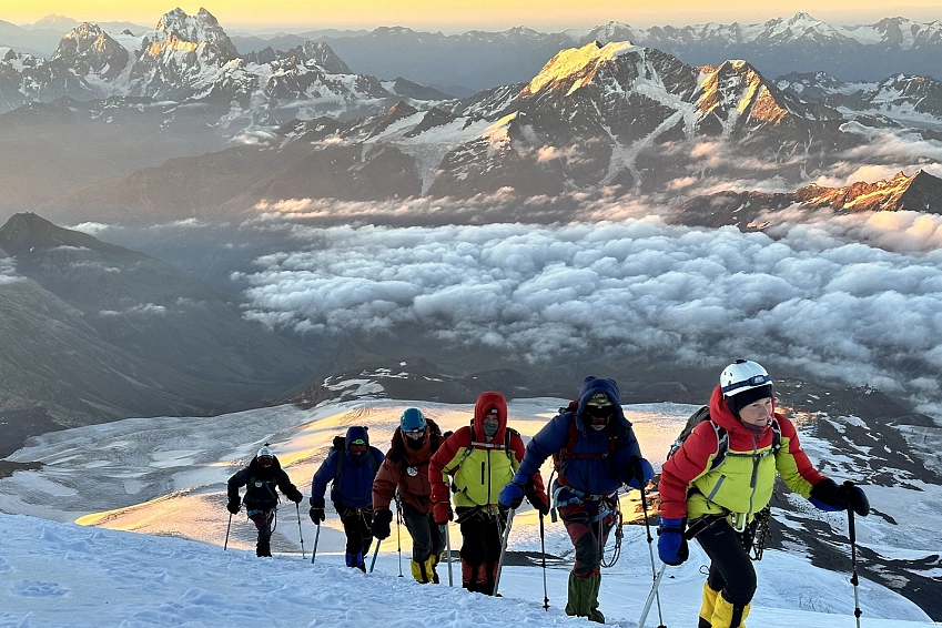 凌晨2点出发。我们将穿着冰爪,佩戴头灯前行。整个登顶和下山过程通常耗时10-12小时。从卡兹别克山顶可欣赏到360度的全景,远处的厄尔布鲁士山清晰可见。下山后返回气象站。