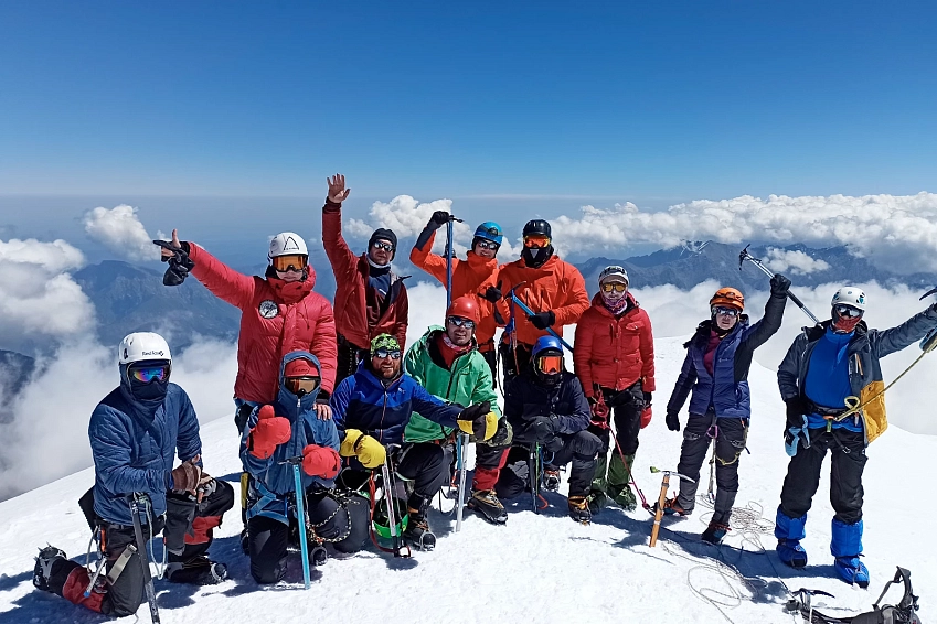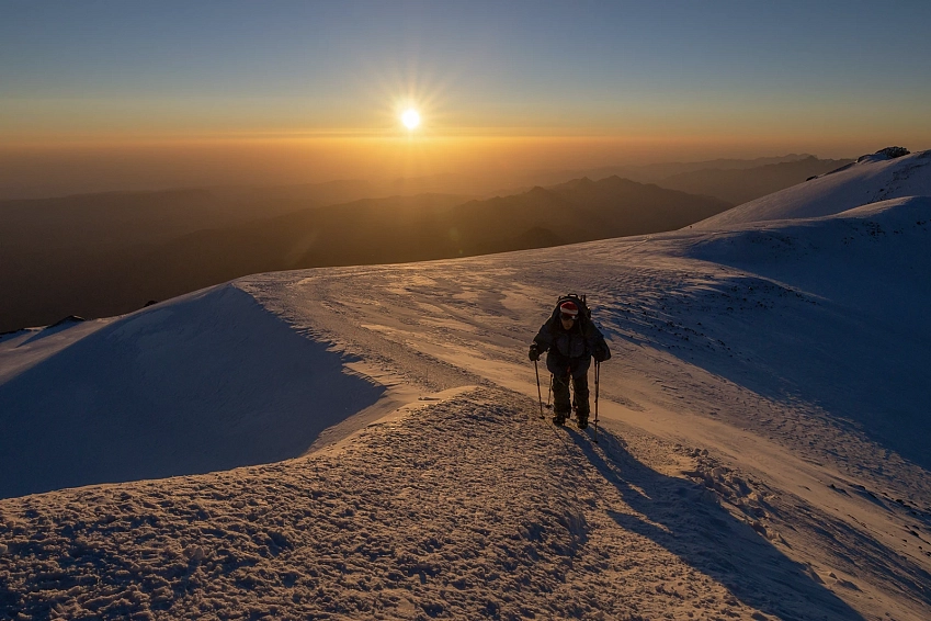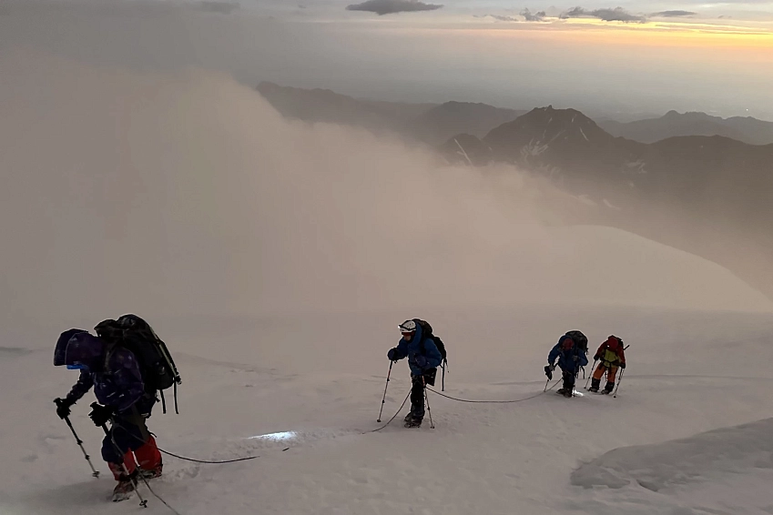 午夜起床,1小时准备时间。我们将前往厄尔布鲁士山的顶峰。从突击营地出发,我们结组而行,穿着冰爪,携带冰镐、头盔和头灯。随身携带小吃、热茶保温瓶和水。我们会非常缓慢地前进,以保持呼吸节奏并节省体力。登顶通常需要8-10小时,下山约需3-4小时。(如果您希望在登顶过程中使用氧气,可以在我们这里租用。)