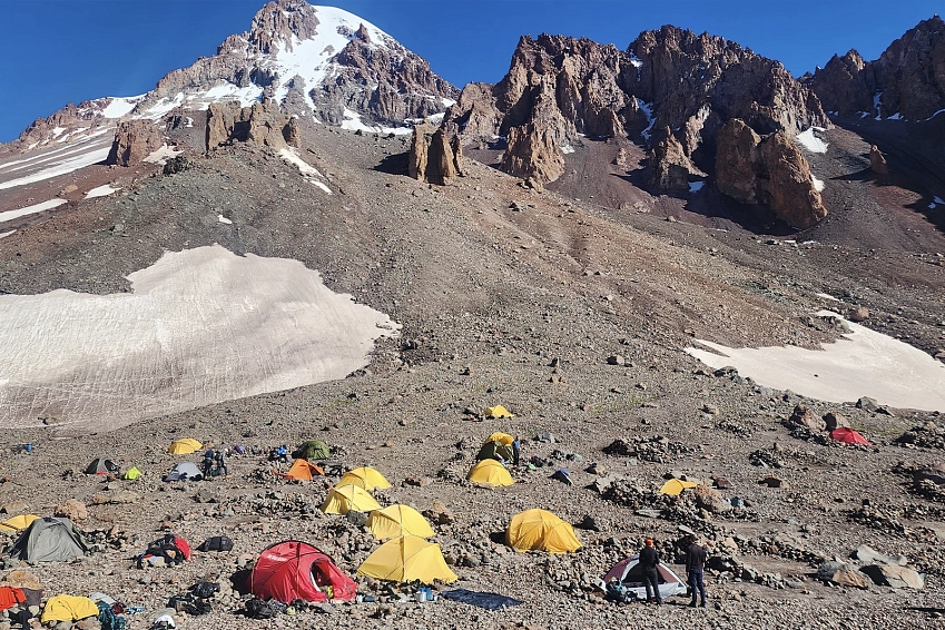 长途跋涉前往海拔3650米的气象站山间小屋(见照片)。一路上,卡兹别克山将始终出现在我们眼前。我们先穿越石地,随后踏上冰川。行程约为5.5小时,距离为8.6公里。住宿安排为帐篷或山间小屋。晚餐。