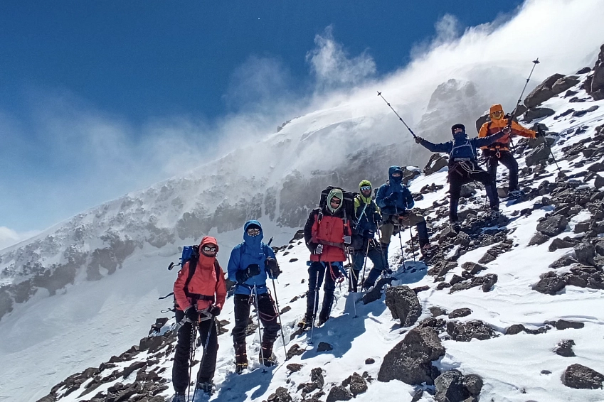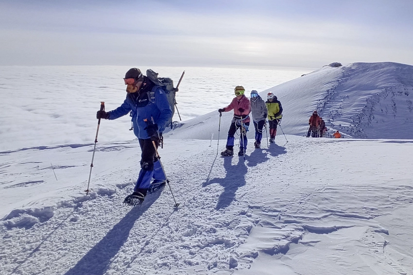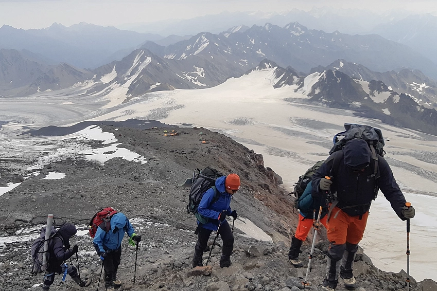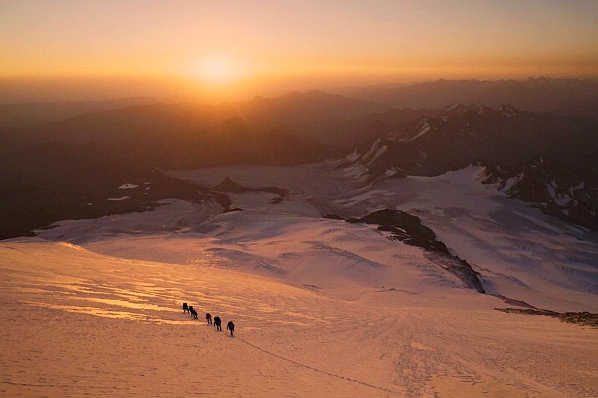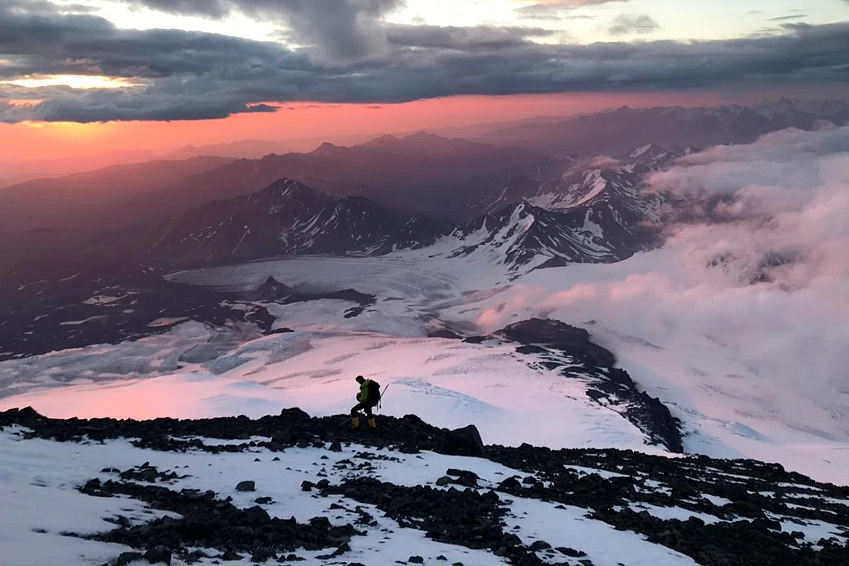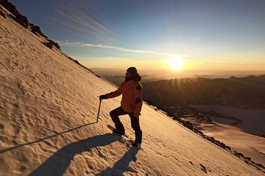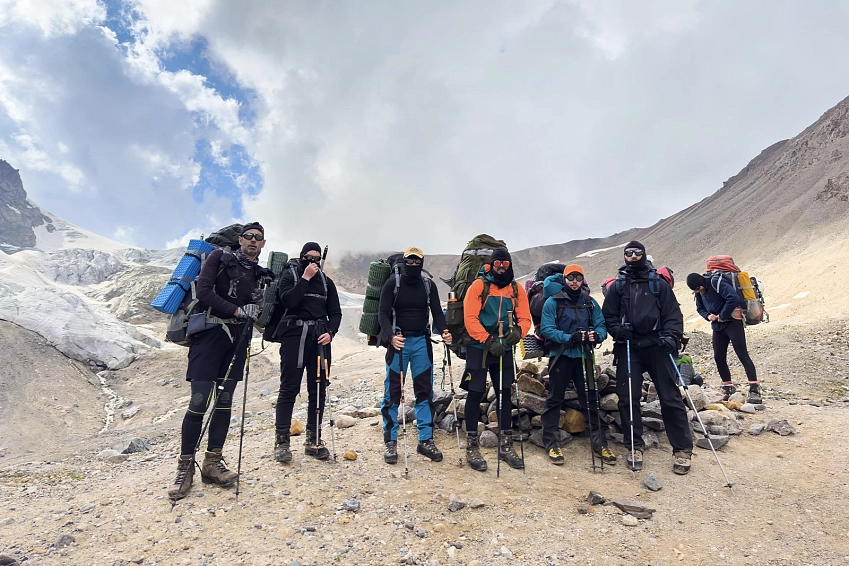 The route passes through the wild and stunning Irik Chat Gorge and the eastern slope of Elbrus, along the Achkeryakol lava flow and past Elbrus’s side crater. After reaching the summit, the group descends via the southern side using a snowcat and cable car, arriving at the hotel the same day after eight days of full autonomy. This is the same program we organized for Ryan Pyle’s TV show Extreme Treks during the filming of his Elbrus episode.