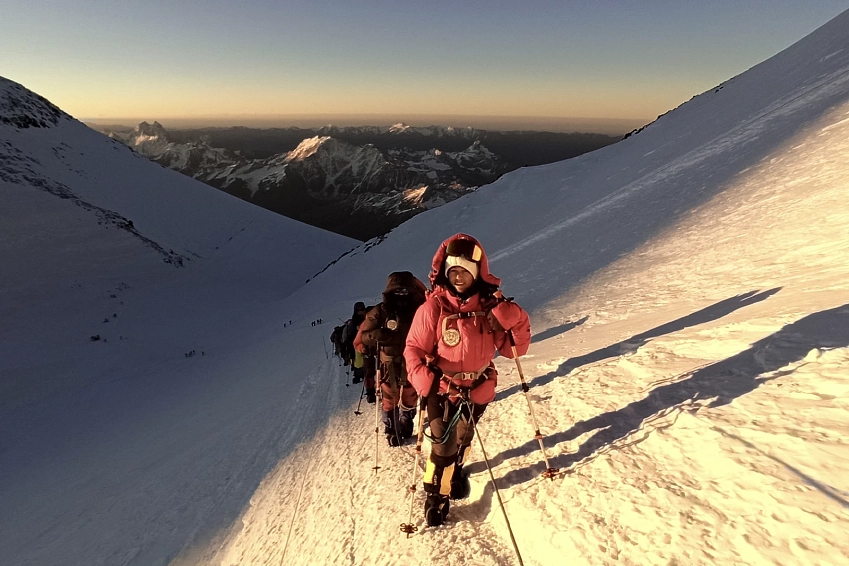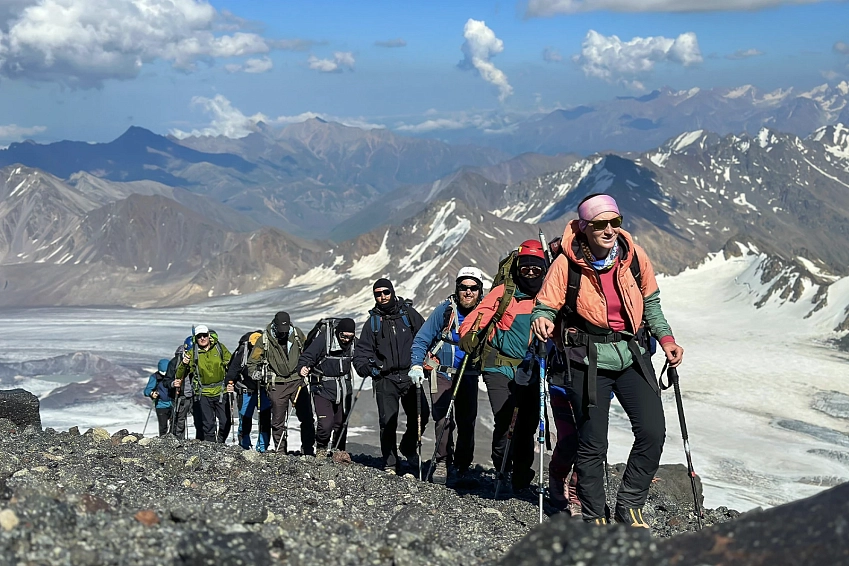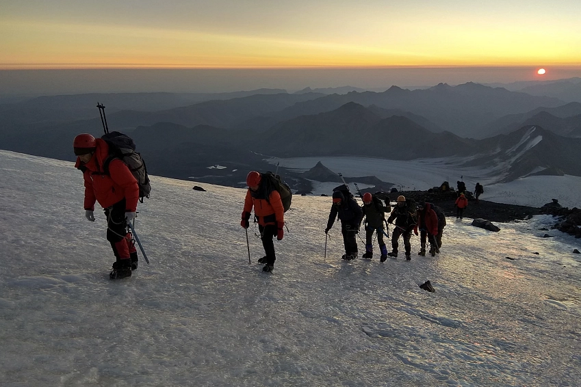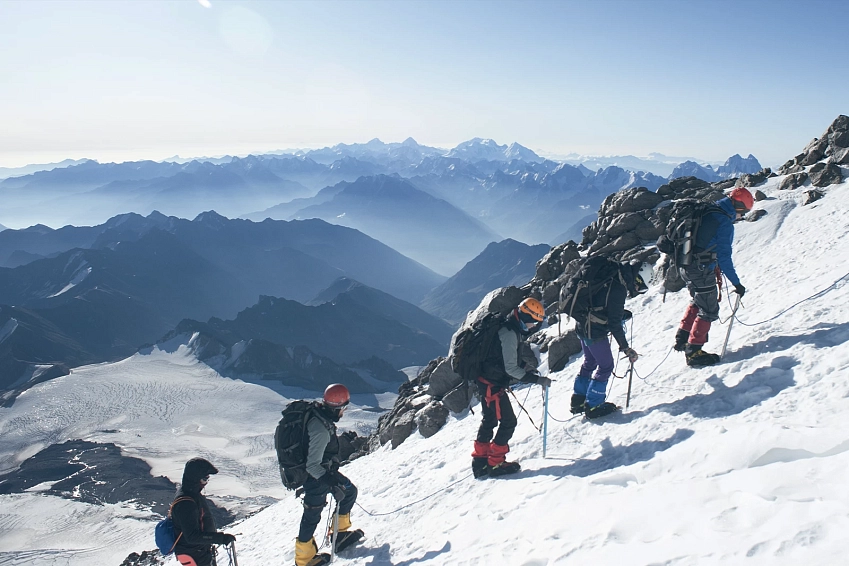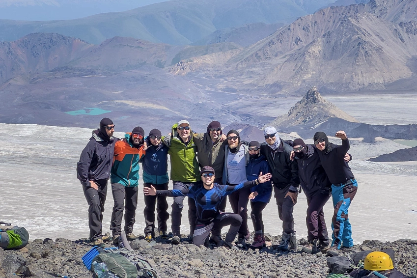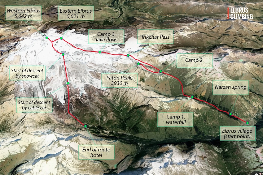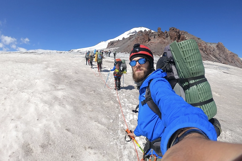 The route passes through the wild and stunning Irik Chat Gorge and the eastern slope of Elbrus, along the Achkeryakol lava flow and past Elbrus’s side crater. After reaching the summit, the group descends via the southern side using a snowcat and cable car, arriving at the hotel the same day after eight days of full autonomy. This is the same program we organized for Ryan Pyle’s TV show Extreme Treks during the filming of his Elbrus episode.