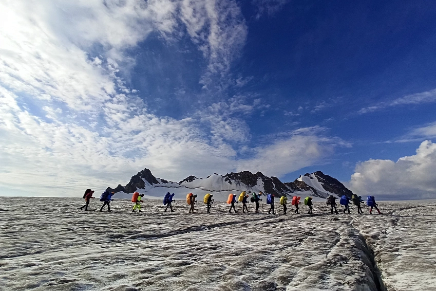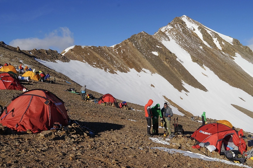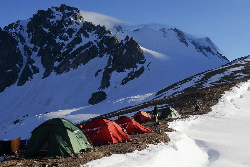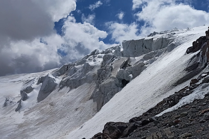 Today we traverse a wide snow-and-ice plateau — a glacier that we’ll cross roped together, as there are many hidden crevasses beneath the snow. We approach the lower rocks of the Achkeryakol lava flow and continue a bit higher to an altitude of 4,000 m. This is Camp 3 — our summit camp. In the afternoon, we’ll hold another training session to practice two essential mountaineering skills: walking in crampons on snow and ice, and self-arrest technique with an ice axe on an icy slope. Elevation gain: 400 m.