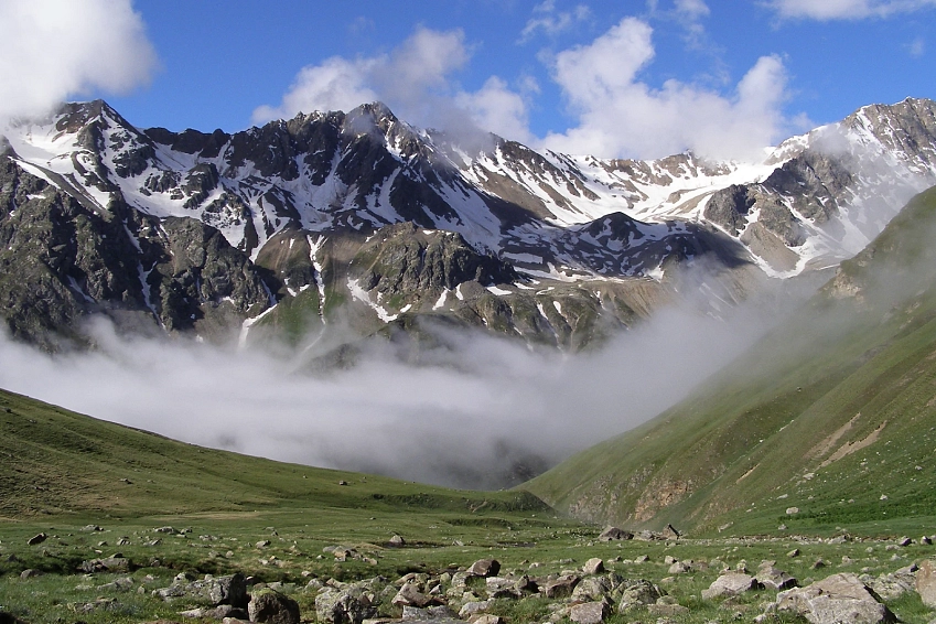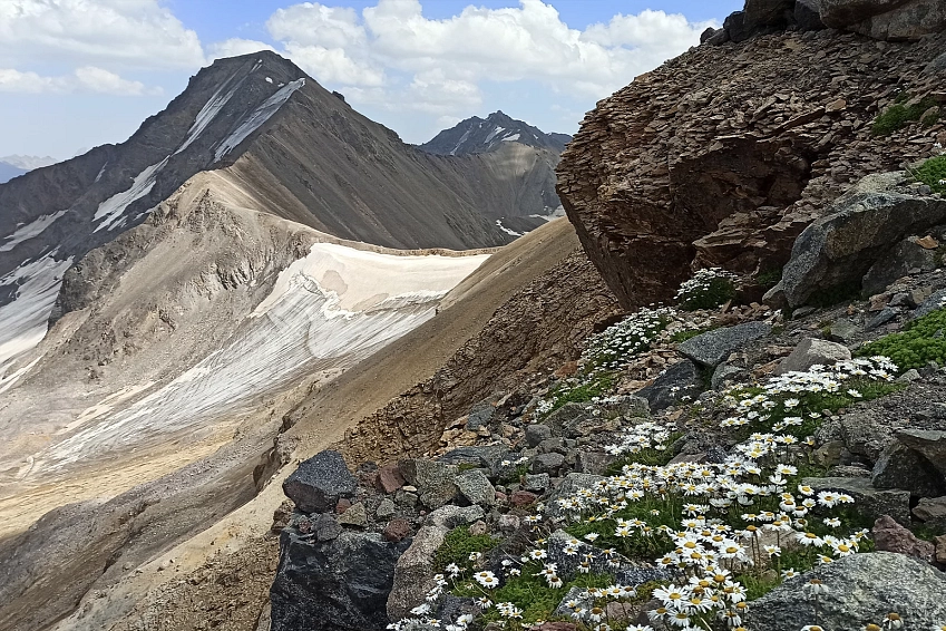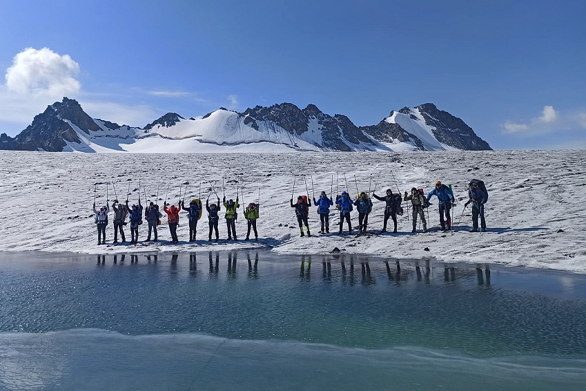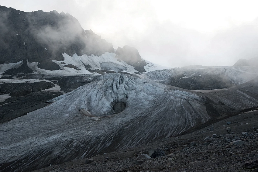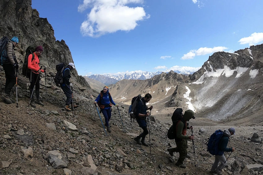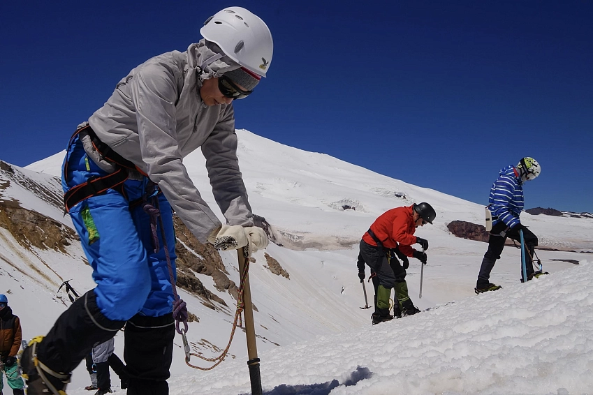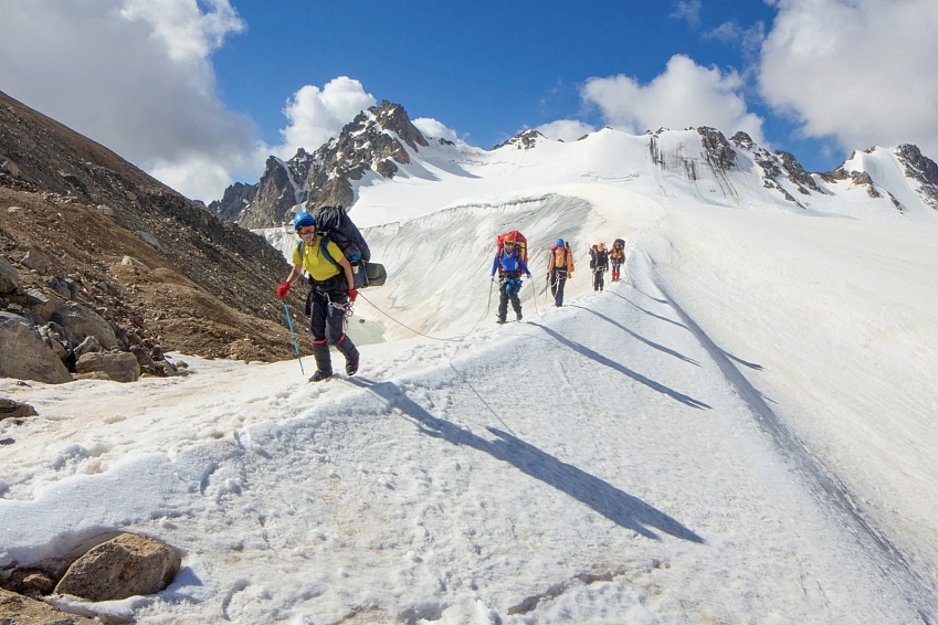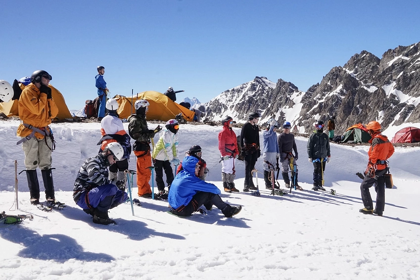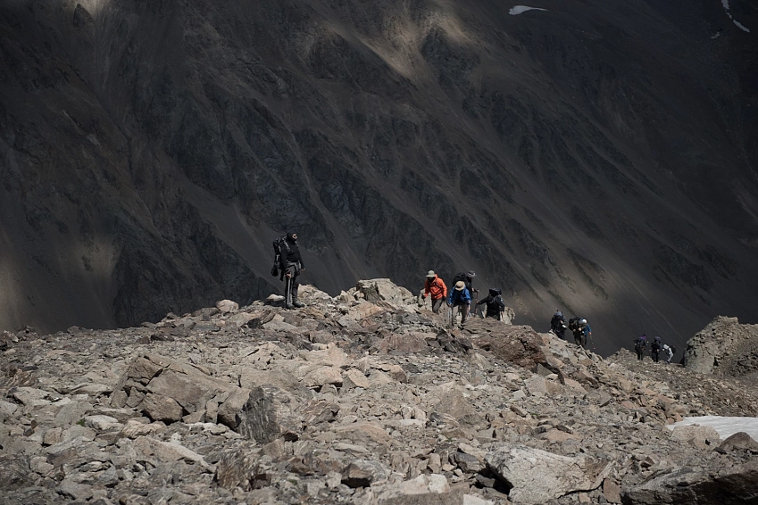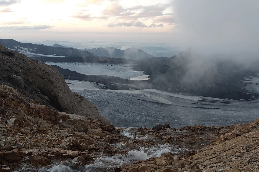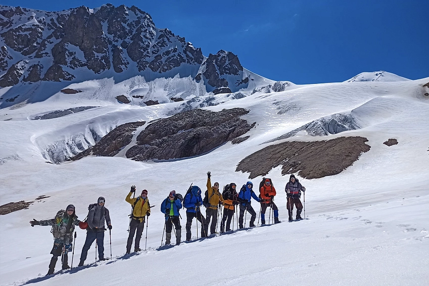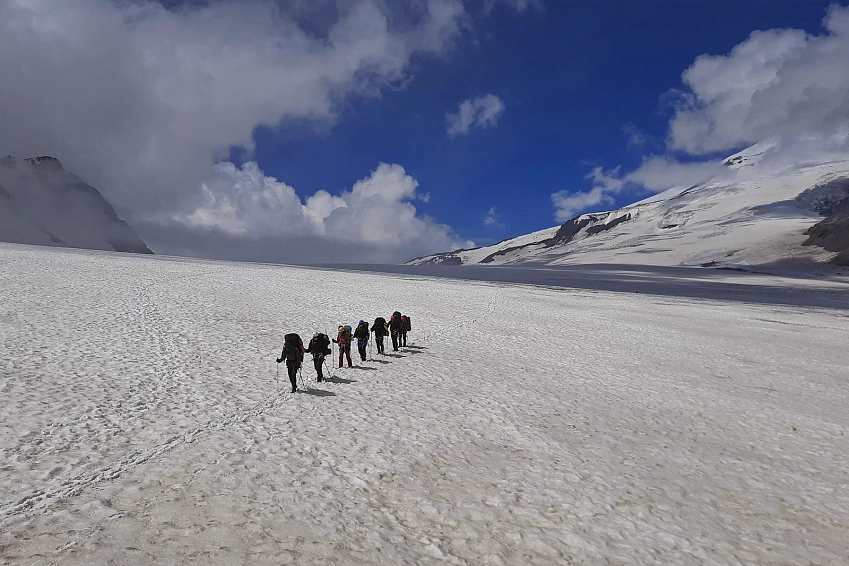 We continue ascending through the Irik Chat Valley. The grassy slopes gradually turn into rocky terrain as we walk alongside the glacier’s tongue and climb up to the Irik Chat Pass (3,667 m). This is our Camp 2 for the night, offering two spectacular views: to the south — the valley we came from, and to the north — the Djikaochenkez ice plateau, Kalitsky Peak, and Mount Elbrus. In the afternoon, your guide will conduct a rope team training session. Elevation gain: 917 m.