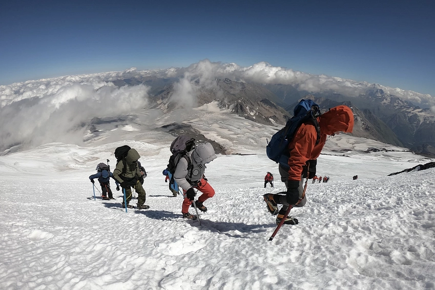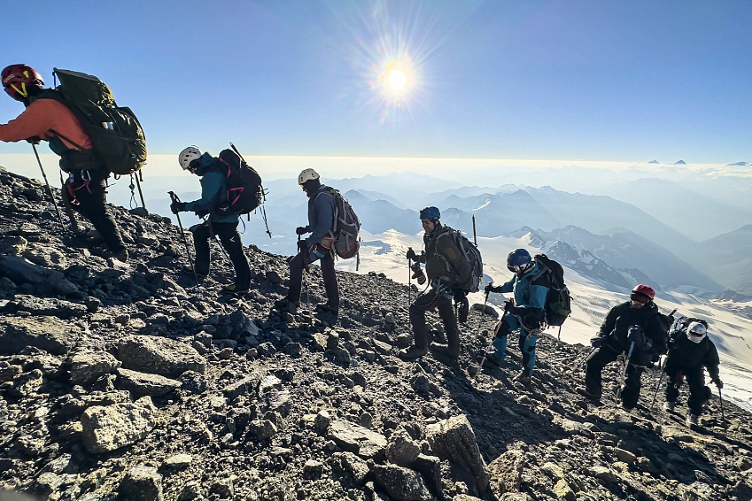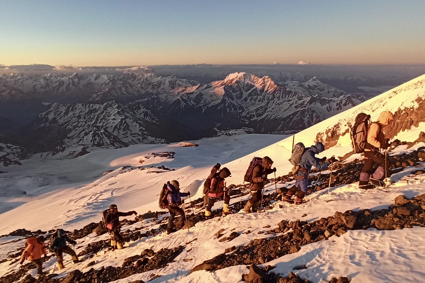 Our main acclimatization climb. We start early in the morning, carrying only essentials — snacks, water, and a thermos with hot tea. The route leads up to 5,000 m, reaching the edge of Elbrus’s side crater. The trail alternates between rock and snow. You’ll feel the thin air today — it will be tough, but this climb provides excellent altitude adaptation. Elevation gain: 1,000 m.