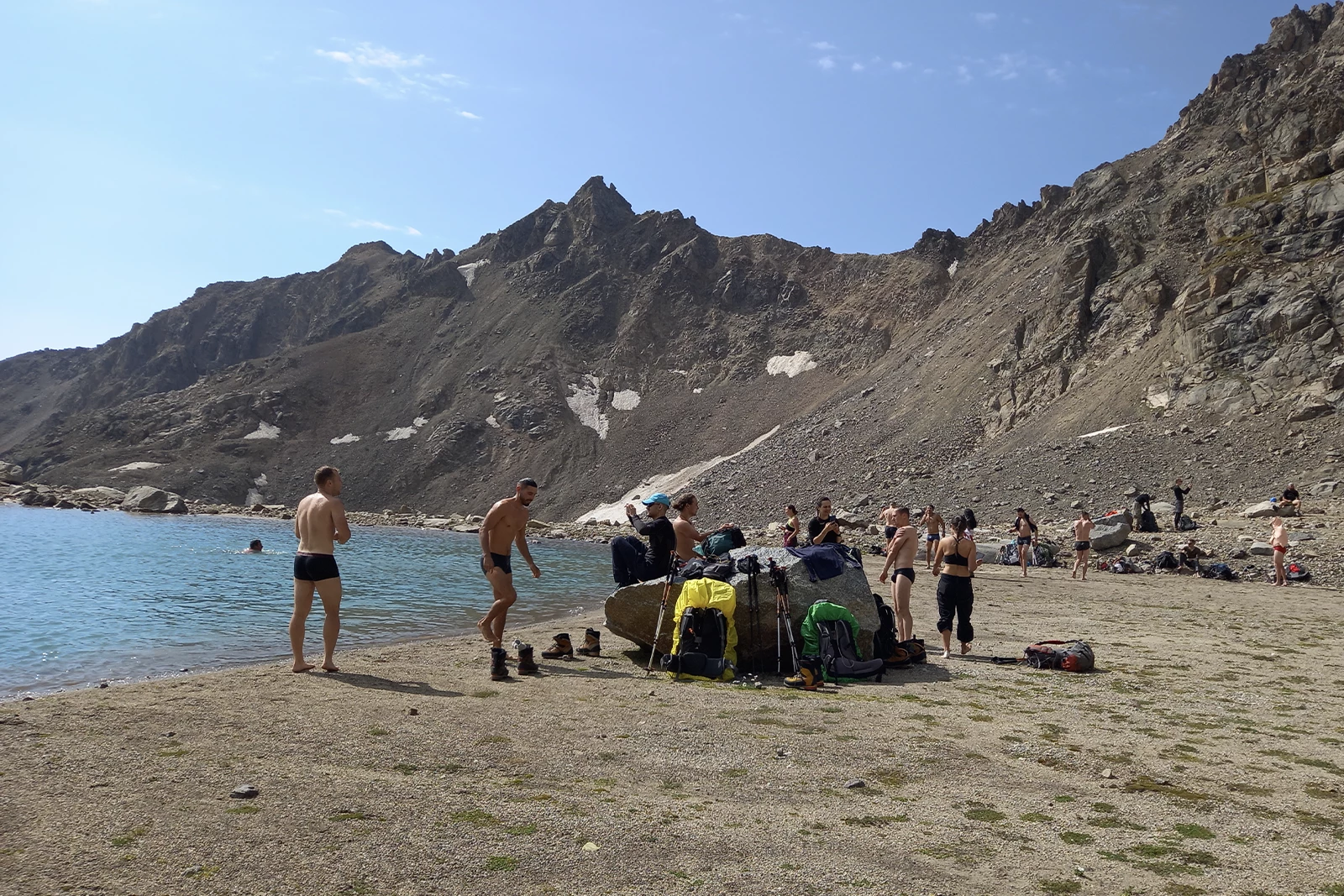 Today we spend the whole day climbing Paton Peak (3,930 m). This is not only a beautiful route but also an excellent acclimatization climb. The trail begins with a crossing of a fast mountain river using fixed steel cables that we installed here a few years ago. We continue up over rocks to reach the ridge. From the summit, there’s a panoramic view of Mount Elbrus, the Achkeryakol lava flow — a side crater of Elbrus — as well as the surrounding mountains and valleys. On the descent, we’ll stop for lunch by a mountain lake.